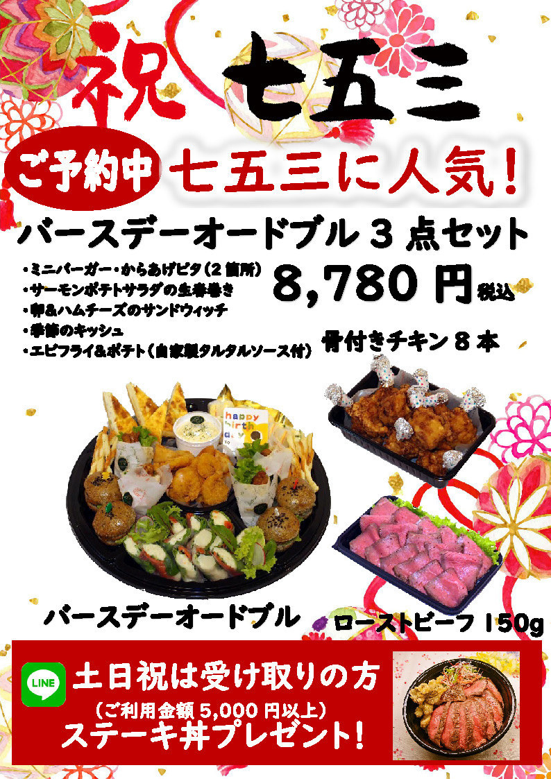 七五三のお食事で、お子様、ファミリーから人気がある「バースデーオードブル3点セット」です。バーガー、唐揚げピタ、キッシュ、サーモンとポテトの生春巻き、卵・ハムチーズサンド、エビフライ&ポテトフライ(自家製タルタル付)のオードブルに、骨付きチキン、ローストビーフ(150g)がセット!