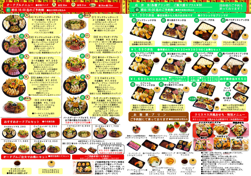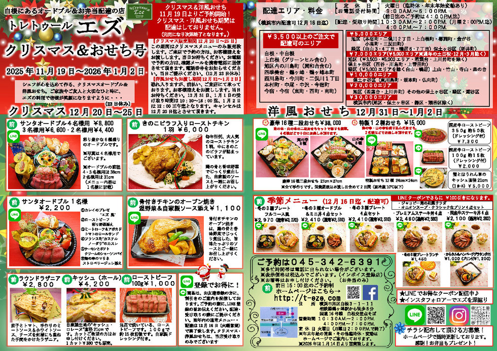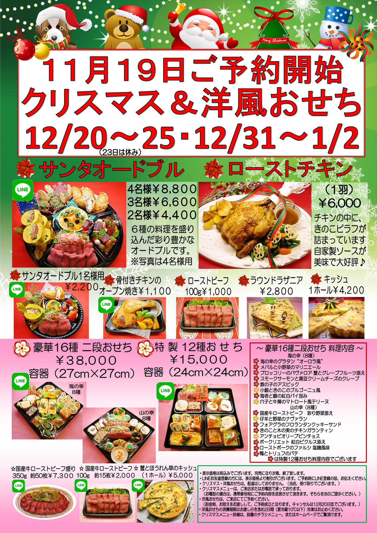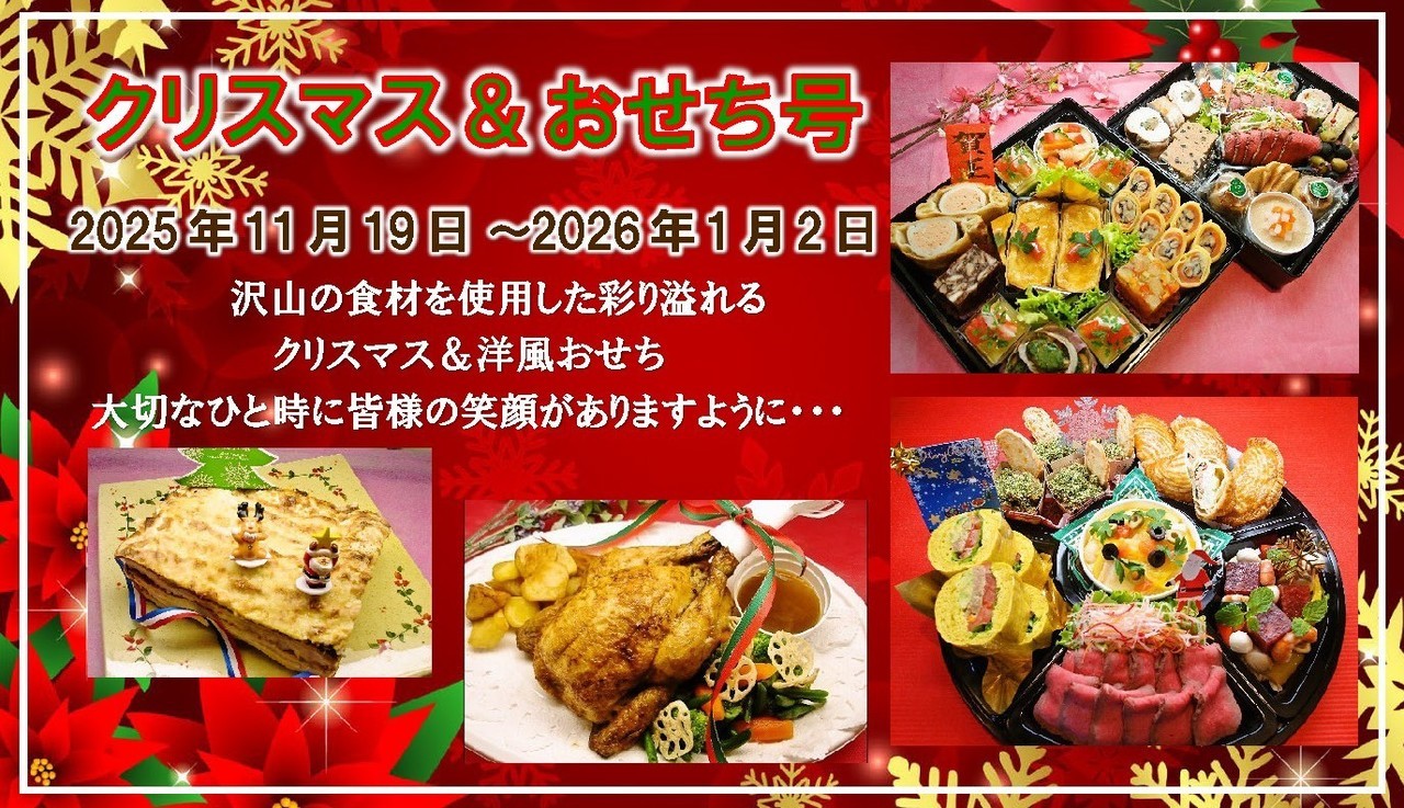 2025年12月20日~25日(23日休み)の期間、クリスマスメニュー、2025年12月31日~2026年1月2日の期間、洋風おせちを販売致します。