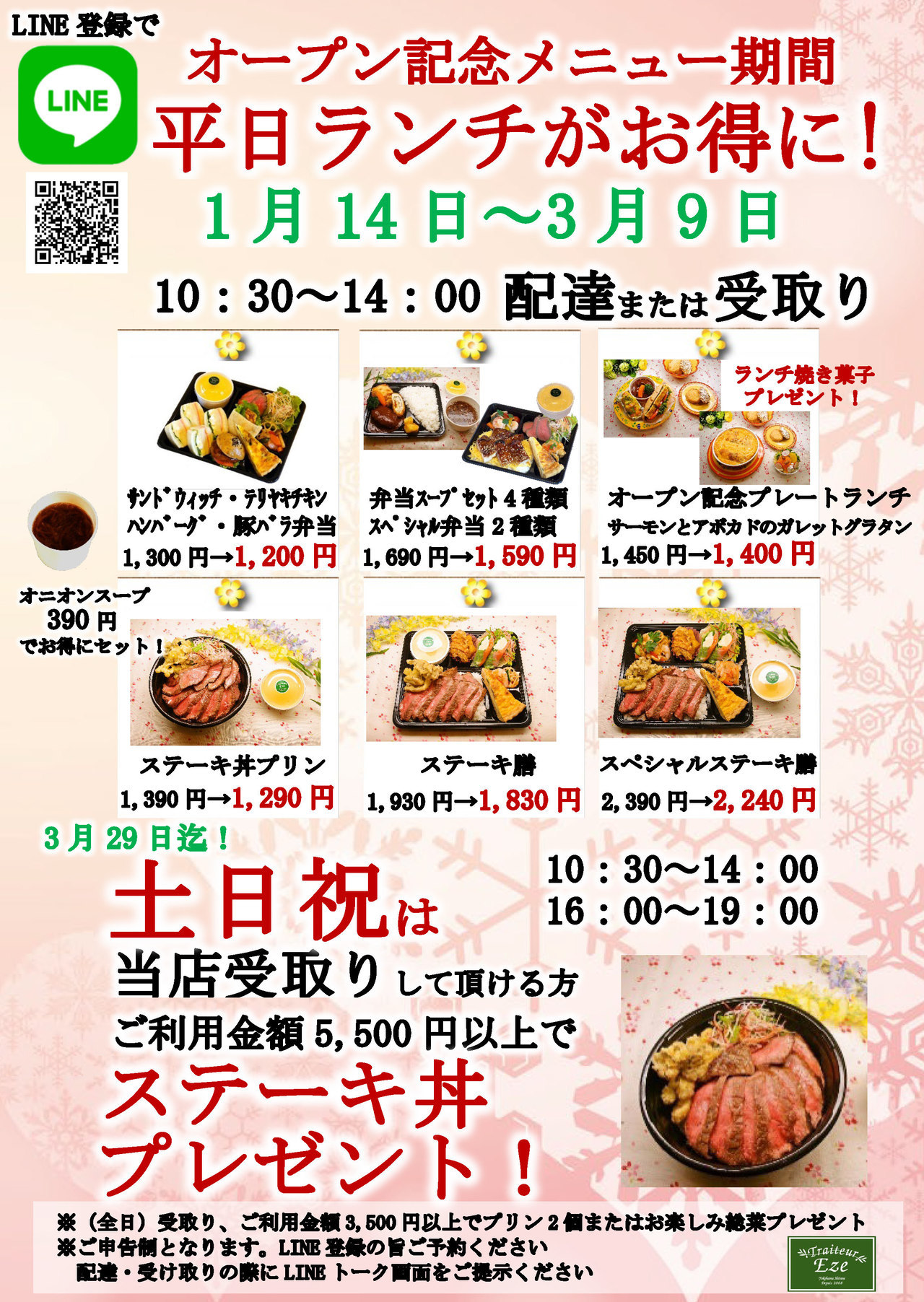 トレトゥールエズ(Traiteur Eze)は横浜市・相鉄線鶴ヶ峰駅にあるオードブル・お弁当・洋食惣菜店です。当店手作りの人気オードブル・仕出し洋風弁当・サンドウィッチ・お惣菜・季節のメニューをスタッフが直接、配達/宅配でお届けしております。大切なお客さまへのお料理、パーティー料理のご相談も承っております。旭区内を中心に横浜市内全域デリバリー対応で地元の皆様にご愛顧頂いております。完全予約制・店頭での受け取りも可能です。ご注文はお電話で承っております。会議弁当、パーティー・お誕生日・記念日等に大変喜ばれており、クリスマス・洋風おせちの販売も行っております。