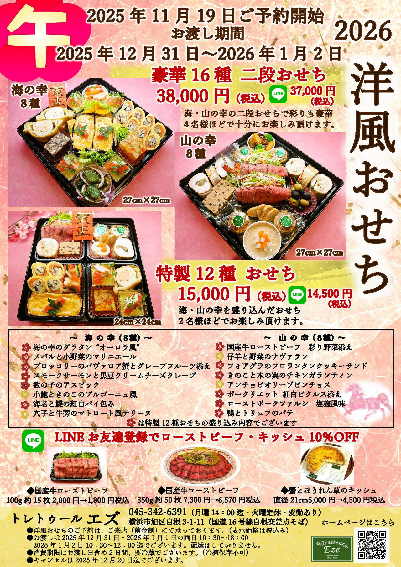 ●特製12種おせち 12月31日・1月1日 両日10:30~18:00、1月2日 10:30~12:00のお渡しでございます。