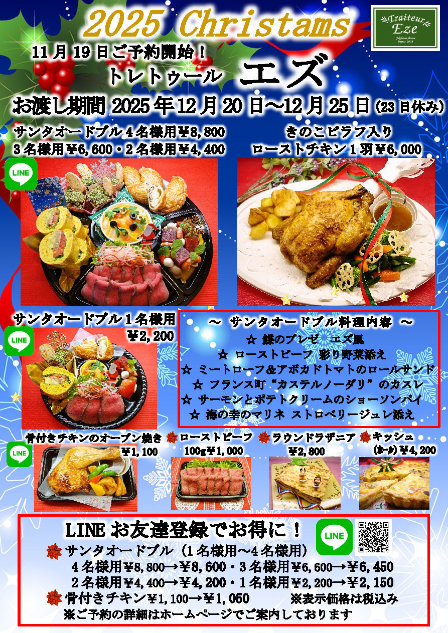 ●お電話で予約の方は、確認メールを携帯番号宛てに送信させて頂きます。当日ご提示ください。設定や不具合で送信出来ない場合がございます。送信不可の場合は再度ご連絡致します。売り切れ次第終了となります。※この期間はクリスマスメニューのみ販売致します。